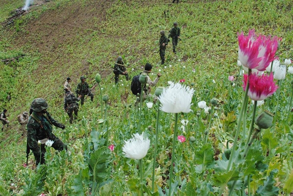 ทหาร ฝ่ายปกครอง ตำรวจ กว่า 50 นาย ระดมกำลังตัดฟันทำลายไร่ฝิ่นห่างชายแดนไทย – พม่า 200 ม. ด้านอำเภอปางมะผ้า จ.แม่ฮ่องสอน กว่า 10 ไร่ คาดเป็นชาวไทยใหญ่สัญชาติพม่า ลักลอบปลูก ก่อนหน้านั้นทาง ฉก.ร.17 ได้ประสานไปยังชนกลุ่มน้อยในพื้นที่เพื่อขอให้มาร่วมตัดไร่ฝิ่นพร้อมกับฝ่ายไทย แต่อ้างยังไม่พร้อม เมื่อวันที่ 16 มกราคม 2557 พันเอก บรรณวัฒน์ พรหมจรรย์ ผู้บังคับหน่วยเฉพาะกิจกรมทหารราบที่ 17 กองกำลังนเรศวร บ้านม่อนตะแลง ต.ผาบ่อง อ.เมือง จ.แม่ฮ่องสอน ได้รับรายงานจากฐานปฏิบัติการชายแดนว่าพบพื้นที่ปลูกฝิ่นบริเวณชายแดนไทย-พม่าจำนวนมาก จึงได้ ระดมกำลังทหาร ฉก.ร.17 , ว่าที่ร้อยตรีณรงค์ชัย จินดาพันธ์ ป้องกันจังหวัดแม่ฮ่องสอน ฝ่ายปกครอง อส.อำเภอปางมะผ้า และเจ้าหน้าที่ตำรวจ สภ.ปางมะผ้า จ.แม่ฮ่องสอน จำนวน 50 นาย เดินทางไปยังพื้นที่ ที่ตรวจพบการปลูกฝิ่น พบว่า สูงจากระดับน้ำทะเลประมาณ 1,393 เมตร ห่างจากชายแดนไทย-พม่า ประมาณ 200 เมตร ห่างจากหมู่บ้านยามชายแดนบ้านปางคอง ต.นาปู่ป้อม อ.ปางมะผ้า จ.แม่ฮ่องสอน ประมาณ 4 กิโลเมตร อยู่ตรงข้ามกับบ้านหนองแหลง เขตรัฐฉาน ประเทศพม่า ซึ่งเป็นเขตปกครองของกองกำลังทหาร SSS ของมหาจ่า ที่เป็นกองกำลังอาสาสมัครพม่า มีหน้าที่รับผิดชอบพื้นที่บ้านหัวเมือง จากการตรวจสอบพื้นที่ปลูกฝิ่น คาดเป็นชาวบ้านในพื้นที่ชายแดนลักลอบปลูกตามลำห้วยและไหล่เขาเป็นแนวยาวประมาณ 400 เมตร มีเนื้อที่ปลูกฝิ่น จำนวน 10 ไร่ ต้นสูงประมาณ 50-60 เซนติเมตร ออกดอกบานสะพรั่งทั้งสีแดง สีขาว พร้อมกรีด และตรวจพบมีร่องรอยของการกรีดยางฝิ่นไปบ้างแล้ว นอกจากนี้พบกระท่อมอยู่กลางไร่ฝิ่น 1 หลัง จึงรื้อและเผาทิ้ง และ เจ้าหน้าที่จึงได้กระจายกำลังเข้าตัดฟันทิ้งใช้เวลาในการตัดฟันประมาณ 2 ชั่วโมง จึงแล้วเสร็จ พันเอกบรรณวัฒน์ พรหมจรรย์ ผบ.ฉก.ร.17 กองกำลังนเรศวร เปิดเผยว่า ไร่ฝิ่นดังกล่าว ตรวจพบครั้งแรกทางอากาศขณะเฮลิคอปเตอร์ส่งเสบียงให้กำลังพลพบมีพื้นที่คล้ายปลูกฝิ่น จึงได้สั่งกำลังทหารในพื้นที่ชายแดน ออกลาดตระตรวจพิสูจน์ทราบ พบว่าเป็นแปลงฝิ่น จึงได้นำกำลังเข้าตัดฟัน พื้นที่ปลูกอยู่ใกล้ชายแดนมาก ยังไม่ทราบว่าเป็นราษฎรในพื้นที่ใดมาลักลอบปลูก จึงได้ให้กำลังทหารประชาสัมพันธ์ให้ราษฎรที่อยู่ตามแนวชายแดนให้เข้าใจถึงปัญหายาเสพติดและไม่ให้มีการปลูกฝิ่น นอกจากนี้ยังได้ประสานให้ทหารพม่าช่วยประชาสัมพันธ์ให้กับราษฎรที่อยู่ชายแดนพม่า ไม่ให้เข้ามาลักลอบปลูกฝิ่นในเขตไทย ส่วนพื้นที่ปลูกฝิ่นในเขตพม่าที่ตรวจพบ ฝ่ายพม่ารับปากว่าจะดำเนินการตัดฟันทำลายให้