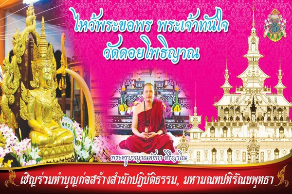 ผู้ร่วมงานเชิญร่วมทำบุญก่อสร้างสำนักปฏิบัติธรรม มหามณฑปหิรัณยพุทธา เพื่อประดิษฐาน พระพุทธรูปเงิน พระบรมสารีริกธาตุพระไตรปิฎก พระธรรมคำสั่งสอน รูปเหมือนพระบูรพาจารย์ และห้องพัก ห้องปฏิบัติธรรมกรรมฐาน งบประมาณรวม 150 ล้านบาทได้ และประชาชนที่มาทำบุญที่วัดนิยมมากราบไหว้พระเจ้าทันใจของที่วัดเพราะขอพรใดจะสมปรารถนาทุกประการและส่วนใหญ่จะสมหวังด้านธุรกิจค้าขายที่ดินและประสบความสำเร็จในหน้าที่การงาน