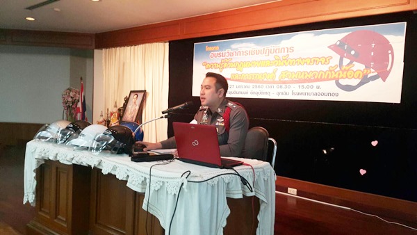 วันนี้ ( 27 ม.ค. 60 ) เวลาประมาณ 09.00 น. ถึง 15.00 น. ที่โรงพยาบาลจอมทอง อ.จอมทอง จ.เชียงใหม่ ภายใต้การอำนวยการของ พ.ต.อ.ฐาปนพงศ์ ชัยรังษี ผกก.กลุ่มงานจราจร ภ.จว.เชียงใหม่ ได้สั่งการให้ พ.ต.ท.ดร.ณรัฐช์พงศ์ อุดมศรี รรท.รอง ผกก.กลุ่มงานจราจร ภ.จว.เชียงใหม่ พร้อมด้วย ร.ต.ท.วิทยา ศิริรัตน์ และ ร.ต.ท.ธงทอง วรรณา จนท.ตร.ศึกษาอบรมจราจรฯ ให้เดินทางไปเป็นวิทยากร และแจกหมวกกันน็อค เพื่อส่งเสริมกระตุ้น จิตสำนึกของการขับขี่ปลอดภัย ในการอบรมวิชาการเชิงปฏิบัติการความรู้กฏหมายวินัยจราจร และการรณรงค์สวมหมวกกันน็อค ตามนโยบายรัฐบาล ณ ห้องประชุมอินทนนท์ รพ.จอมทอง โดยมี พ.ต.อ.ไพศาล นันตา ผกก.สภ.จอมทอง เป็นประธานในการปิดการอบรมฯ ในครั้งนี้ ซึ่งมีผู้เข้าร่วมการอบรมครั้งนี้ จำนวนกว่า 50 คน อาทิ แพทย์ พยาบาล พนักงานเจ้าหน้าที่ ของ รพ.จอมทอง เป็นต้น.