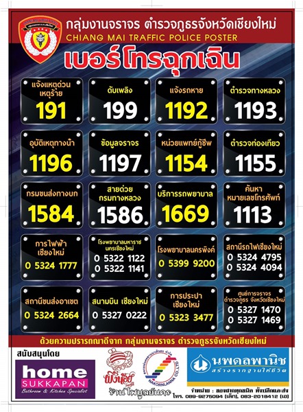 วันนี้ ( 4 ก.พ. 60 ) กลุ่มงานจราจร ภ.จว.เชียงใหม่ โดย พ.ต.อ.ฐาปนพงศ์ ชัยรังษี ผกก.กลุ่มงานจราจรฯ พร้อมด้วย พ.ต.ท.ดร.ณรัฐช์พงศ์ อุดมศรี รรท.รอง ผกก.ฯ ได้ จัดทำเอกสารประชาสัมพันธ์ประจำเดือน มกราคม 2560 ของกลุ่มงานจราจรฯ เกี่ยวกับเบอร์โทรฉุกเฉินและเบอร์โทรหน่วยงานที่สำคัญให้กับประชาชน และนักท่องเที่ยวที่เดินทางเข้ามาในพื้นที่อำเภอเมืองเชียงใหม่ เพื่อการติดต่อช่วยเหลือที่ถูกต้องรวดเร็ว ในการบริการด้านเหตุด่วน เหตุร้ายที่อาจจะเกิดขึ้นได้ เพื่อความสะดวก รวดเร็ว และปลอดภัย ตามนโยบายของตำรวจภูธรจังหวัดเชียงใหม่ โดยจัดทำเป็นแผ่นโปสเตอร์แจกฟรี สามารถติดต่อขอรับได้แล้วตั้งแต่วันนี้ ณ จุดประชาสัมพันธ์ ห้องเปรียบเทียบปรับอาคารกลุ่มงานจราจร( อาคาร สภ.เมืองเก่า ) ถ.ราชดำเนิน ต.พระสิงห์ อ.เมือง จ.เชียงใหม่ ตั้งแต่บัดนี้เป็นต้นไป โดยการจัดทำแผ่นโปสเตอร์ประชาสัมพันธ์ได้รับการสนับสนุนจาก ร้านโฮมสุขภัณฑ์ ร้านผึ้งน้อยเบเกอรี่ สหกรณ์เดินรถนครเชียงใหม่ และร้านนพดลพานิช.