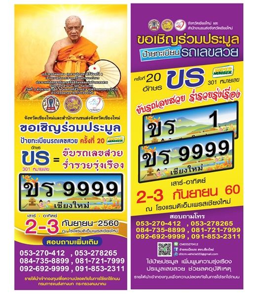 ผู้สื่อข่าวซีเอ็มสกายนิวส์เชียงใหม่ ได้รับการเปิดเผยจากนายชาญชัย กีฬาแปง ขนส่งจังหวัดเชียงใหม่ ว่า จังหวัดเชียงใหม่และสำนักงานขนส่งจังหวัดเชียงใหม่ ขอเชิญทุกท่านที่มีความสนใจป้ายทะเบียนรถเลขสวยอักษร ขร มีความหมายว่า ขับรถเลขสวย ร่ำรวยรุ่งเรือง จำนวน 301 หมายเลข และผ่านการประกอบพิธีเสริมศิริมงคล โดยพระพรหมมงคล (หลวงปู่ทอง ศิริมังคโล) เจ้าอาวาสวัดพระธาตุศรีจอมทองวรวิหาร อ.จอมทอง จ.เชียงใหม่ ได้โปรดเมตตานั่งอธิษฐานจิตและประพรมน้ำพระพุทธมนต์แผ่นป้ายทุกแผ่นเพื่อความเป็นศิริมงคลแก่ผู้ประมูลได้ ให้เดินทางด้วยความปลอดภัย มีความเจริญรุ่งเรืองมั่งมีศรีสุขในชีวิต ทั้งผู้ประมูลและครอบครัว โดยสำนักงานขนส่งจังหวัดเชียงใหม่จะทำการประมูลด้วยวาจา ในวันที่ 2-3 ก.ย. 60 ณ โรงแรมดิเอ็มเพรสเชียงใหม่ อ.เมืองเชียงใหม่ จ.เชียงใหม่ ซึ่งการจัดการประมูลป้ายทะเบียนรถสวยในครั้งนี้นับเป็นครั้งที่ 20 แล้วและรายได้จากการประมูลทั้งหมดนำเข้ากองทุนเพื่อความปลอดภัยในการใช้รถใช้ถนน กรมการขนส่งทางบก กระทรวงคมนาคมต่อไป .