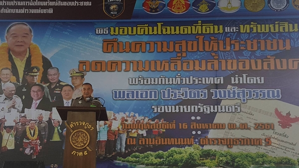 ทั้งนี้เป็นโฉนดที่ดินจำนวน 2,079 ฉบับ รวมเนื้อที่ทั้งหมด 7,790 ไร่ 1 งาน 85 ตารางวา รถยนต์จำนวน 102 คัน รถจักรยานยนต์จำนวน 298 คัน มูลค่าทรัพย์สินรวมทั้งสิ้น 2,905,901,431 บาท (สองพันเก้าร้อยห้าล้านเก้าแสนหนึ่งพันสี่ร้อยสามสิบเอ็ดบาท) โดยในส่วนของตำรวจภูธรภาค 5 มีประชาชนที่ได้รับคืนทรัพย์สินทั้งหมด 134 ราย ทั้งนี้เป็นโฉนดที่ดินจำนวน 140 ฉบับ รวมเนื้อที่ทั้งหมด 199 ไร่ 2 งาน 86 ตารางวา มูลค่ารวมทั้งสิ้น 79,080,870 บาท (เจ็ดสิบเก้าล้านแปดหมื่นแปดร้อยเจ็ดสิบบาท) เพื่อเป็นการบรรเทาความเดือดร้อนและแก้ไขปัญหาให้กับประชาชนที่ถูกเอารัดเอาเปรียบจากนายทุน ซึ่งเป็นไปตามนโยบายของรัฐบาล