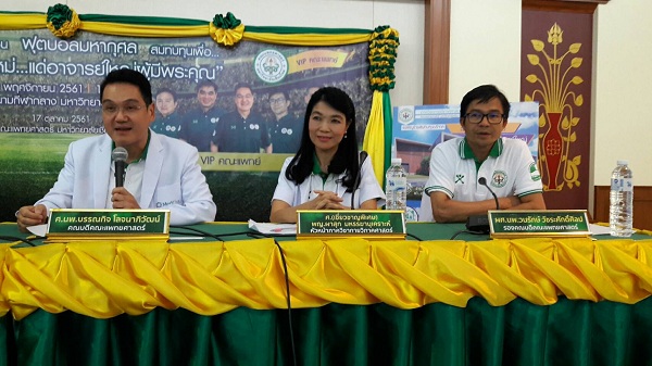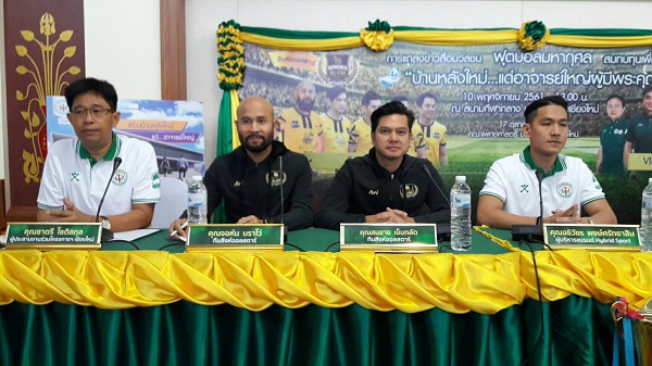 เมื่อวันที่ 17 ตุลาคม 2561 ณ ชั้น 15 ตึกเฉลิมพระบารมี คณะแพทยศาสตร์ มหาวิทยาลัยเชียงใหม่ ศ.นพ.บรรณกิจ โลจนาภิวัฒน์ คณบดีคณะแพทยศาสตร์ มช.ศ.(เชี่ยวชาญพิเศษ) พญ.ผาสุก มหรรฆานุเคราะห์ หัวหน้าภาควิชากายวิภาคศาสตร์ คณะแพทยศาสตร์ มช. ผศ.นพ.วนรักษ์ วัชระศักดิ์ศิลป รองคณบดีคณะแพทยศาสตร์ มช. คุณเต๋า สมชาย เข็มกลัด คุณจอห์น บราโว่ คุณอธิวัชร พงษ์ศรัทธาสิน ผู้บริหารแบรนด์ Hybrid Sport และคุณชาตรี โชติกุล ผู้ประสานงานร่วมโครงการฯ ร่วมแถลงข่าว งานโครงการแข่งขันฟุตบอลมหากุศลในโครงการบ้านหลังใหม่อาจารย์ใหญ่ ครู…ผู้ไร้ลมหายใจ