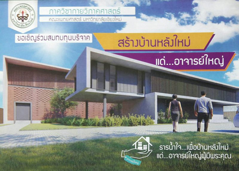 ศ.นพ.บรรณกิจ โลจนาภิวัฒน์ เปิดเผยว่าคณบดีคณะแพทยศาสตร์ มช.โดยภาควิชากายวิภาคศาสตร์ ได้จัดให้มีโครงการ “สร้างบ้านหลังใหม่ แด่อาจารย์ใหญ่ผู้มีพระคุณ” ขึ้นเพื่อสมทบทุนมูลนิธิโรงพยาบาลสวนดอก จัดสร้างอาคารสำหรับเป็นสถานที่รักษาสภาพร่างอาจารย์ใหญ่ให้เป็นไปอย่างมีประสิทธิภาพได้มาตรฐาน จัดทำโครงกระดูกอาจารย์ ห้องเก็บกระดูกอาจารย์ใหญ่ และห้องปฏิบัติงานวิจัยที่เกี่ยวข้องกับอาจารย์ใหญ่ รวมทั้งพัฒนาระบบการบริหารจัดการร่างอาจารย์ใหญ่ให้มีความทันสมัย รองรับการให้บริการด้านการเรียนการสอน เป็นสถานที่ศึกษาดูงานสำหรับสถาบันหรือหน่วยงานต่างๆที่เกี่ยวข้องกับอาจารย์ใหญ่ ตลอดจนแสดงความกตัญญูกตเวทีต่ออาจารย์ใหญ่ผู้ซึ่งเสียสละร่างเพื่อการศึกษา