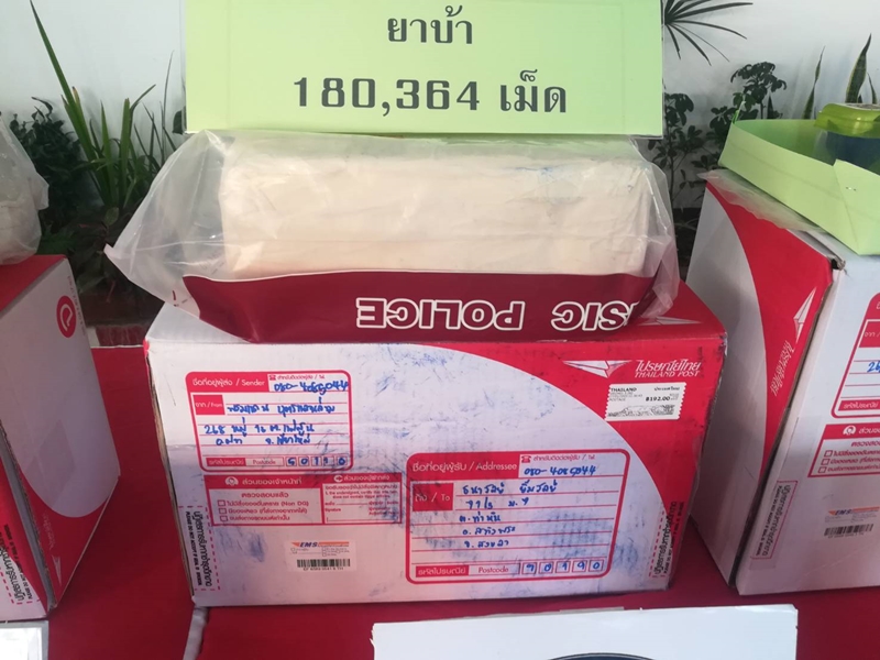 พร้อมของกลาง ยาบ้า จำนวน 90 มัด รวมประมาณ 180,000 เม็ด ซุกซ่อนในกล่องพัสดุไปรษณีย์ จำนวน 4 กล่อง ,ยาบ้า รวมจำนวน 364 เม็ด ตรวจค้นพบในบ้านของผู้ต้องหา และของกลางอื่น ๆ