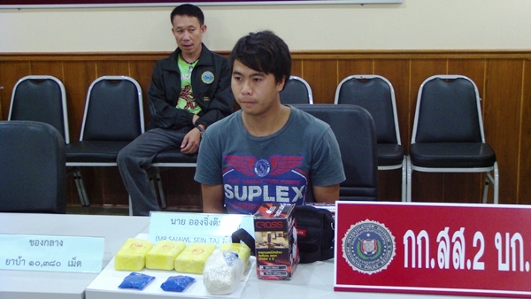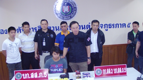 เมื่อเวลา 10.00 น.ของวันที่ 22 พ.ย.56 พล.ต.ต.ประจวบ วงศ์สุข ผบก.สส.ภ.5 พ.ต.อ.จารึก ลิ้มสุวรรณ รอง.ผบก.สส.ภ.5 พ.ต.อ.ชินวัช วัชัยธนพัฒน์ รอง.ผบก.สส.ภ.5 พ.ต.อ.ธนะรัชต์ ชุมสวัสดิ์ รอง.ผบก.สส.ภ.5 พ.ต.อ.สมบูรณ์ หอมนาน รอง.ผบก.สส.ภ.5 พ.ต.อ.พิทักษ์ นาสมวาส ผกก.สส.2 บก.สส.ภ.5 ได้ควบคุมตัว นายอองจิ่งต๊ะ ลุงมู อายุ 23 ปี สัญชาติพม่า พักอยู่หอพักไม่มีชื่อ หมู่ 2 ต.ท่าศาลา อ.เมือง จ.เชียงใหม่ อาชีพรับจ้างก่อสร้างทั่วไป พร้อมของกลางเป็นยาบ้า จำนวน 10,380 เม็ด พร้อมรถจักรยานยนต์ ฮอนด้า หมายเลขทะเบียน จบม-491 เชียงใหม่ จำนวน 1 คัน โดยทางเจ้าหน้าที่สามารถจับกุมตัวได้ที่บริเวณริมถนน บ้านแม่โจ้ ซ.9 ต.หนองหาร อ.สันทราย จ.เชียงใหม่