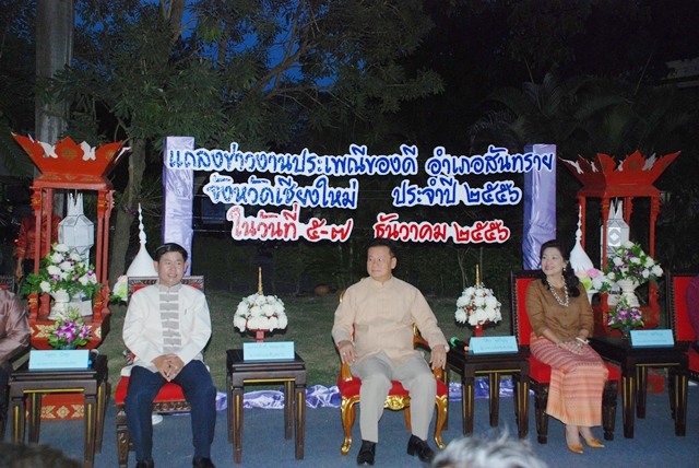 ผู้ว่าราชการจังหวัดเชียงใหม่ กล่าวว่า การจัดงาน“งานประเพณีของดีอำเภอสันทราย” ประจำปี 2556 ที่จะจัดขึ้นระหว่างวันที่ 5-7 ธันวาคม 2556 เพื่อเป็นการอนุรักษ์วัฒนธรรมประเพณี และประชาสัมพันธ์ของดีอำเภอสันทราย และขอให้สื่อมวลชนจังหวัดเชียงใหม่ ช่วยกันประชาสัมพันธ์ข่าวการจัดงานในครั้งนี้ด้วย เพื่อให้ผู้คนได้รับรู้ข่าวสารเกี่ยวกับการจัดงาน ให้นักท่องเที่ยวมาเที่ยวงานประเพณีของดีอำเภอสันทราย